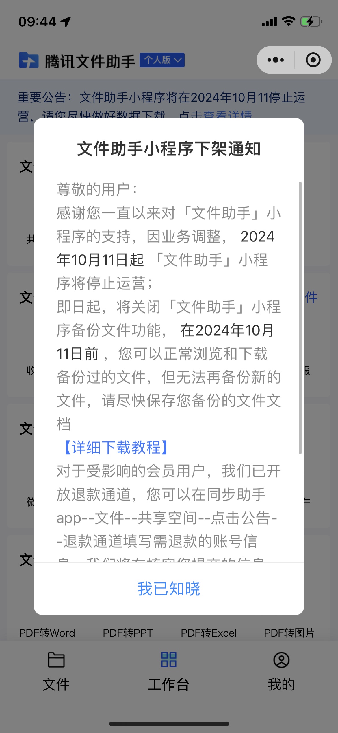 腾讯文件帮手日前发布告诉,称因事务调整,2024 年 10 月 11 日起文件帮手小程序将中止运营;即日起,将封闭文件帮手小程序备份文件功用,在 2024 年 10 月 11 日前,用户能够正常阅读和下载备份过的文件,但无法再备份新的文件。